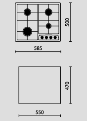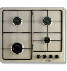 60 cm hob, 4 gas burners with safety valves, ignition control knob, front controls, enamelled pan supports.