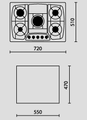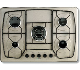 70 cm hob, 4 gas burners + 1 triple ring with safety valves, ignition control knob, front controls, enamelled pan supports.